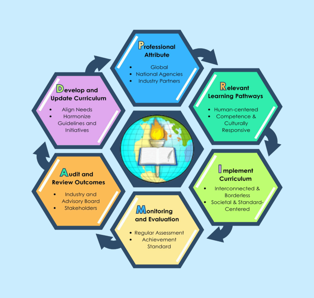 P.R.I.M.A.D. guides evidence-based curriculum design, evaluation, and continuous improvement. It provides a systematic approach to curriculum development and review, ensuring alignment with institutional goals, stakeholder needs, and national and international standards. Thus, it is guided by a clear governance structure, quality assurance cycle and academic rigor.