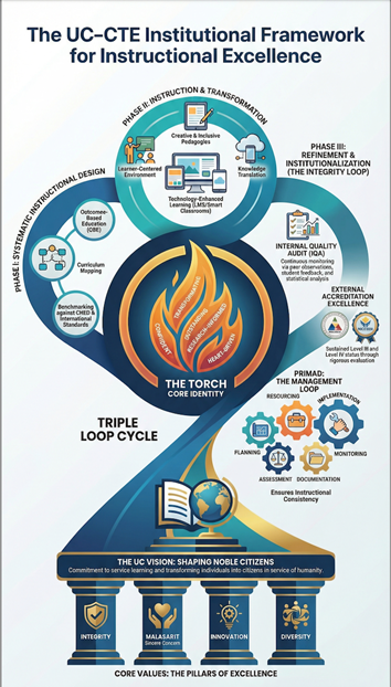 This infographic details what the UC-CTE Institutional Framework promotes and how the institution achieves it. Grounded in UC’s vision of shaping noble citizens, it promotes the institution’s core values of Integrity, Malasakit, Innovation, and Diversity, driving education that transforms learners into citizens in the service of humanity.