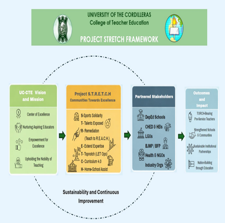 The Project S.T.R.E.T.C.H. Framework of the University of the Cordilleras – College of Teacher Education operationalizes its Vision and Mission by translating its commitment to excellence and service into structured, sustainable institutional linkages. Anchored on the development of a Center of Excellence and the formation of empowered, competent educators, the framework integrates initiatives such as remediation, talent development, LET support, curriculum innovation, and home-school engagement. These programs are implemented through strategic partnerships with various government agencies, NGOs, and industry stakeholders to ensure relevance and shared accountability. The framework generates measurable outcomes, including TORCH-bearing pre-service teachers, strengthened schools and communities, and sustained collaborative networks. Guided by quality assurance principles and continuous improvement, Project S.T.R.E.T.C.H. aligns extension and instructional initiatives with accreditation standards and institutional performance goals.